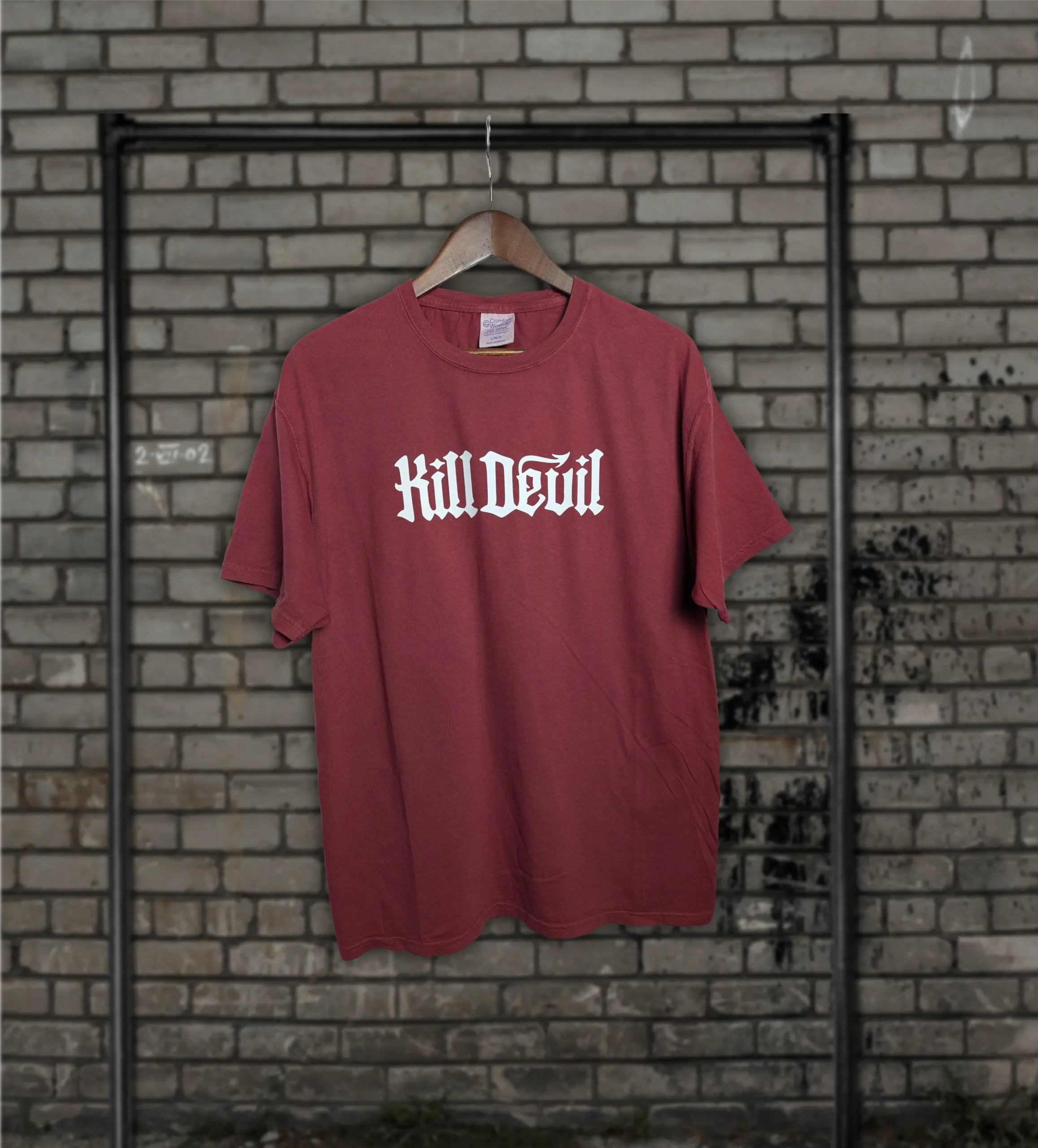 Premium Comfort Wash garment-dyed tee with white foam print on wine red.